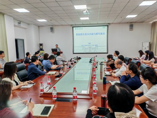 王鹏从咨政报告基本内涵、咨政报告撰写要点以及咨政报告案例分享三个方面进行了详细的讲解。他建议撰写咨政报告应坚持专门化研究与跨学科研究相结合、坚持高校与实际部门想结合,多学习、抓热点、勤转化,形成内容实、研究深、文笔美的高质量咨政报告。