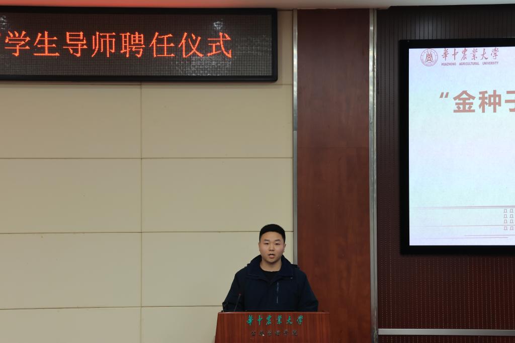 行政管理2002班的汪扬作为学生导师代表发言。他从初心、使命、担当等三个角度,阐述了自己成为学生导师的初心和未来的工作计划,鼓励所有学生导师以身作则、以心换心,号召大家尽心竭力、善始善终、善作善成,为帮扶对象提供关爱和支持、信任和鼓励、理解和包容、欣赏和肯定。